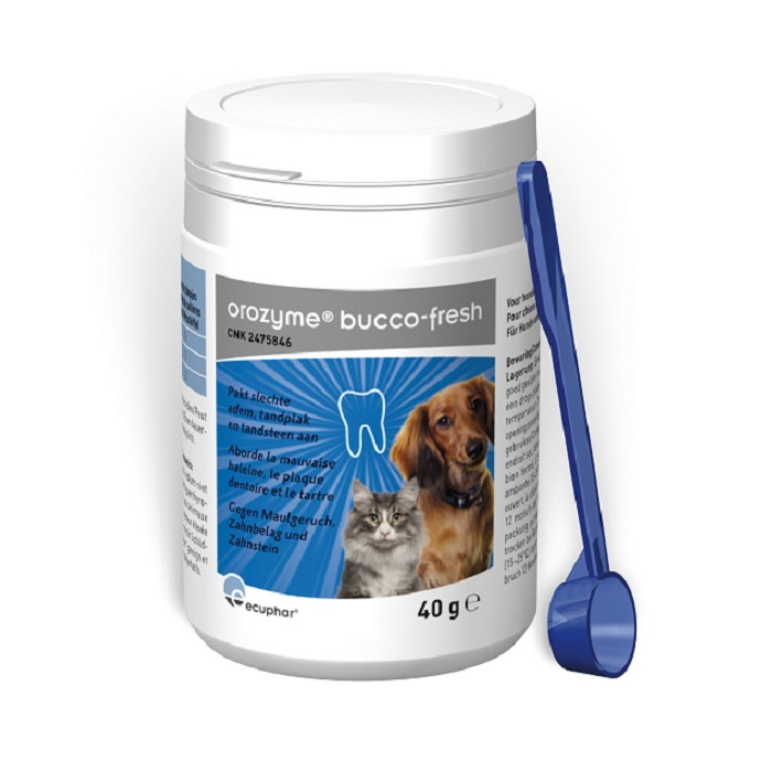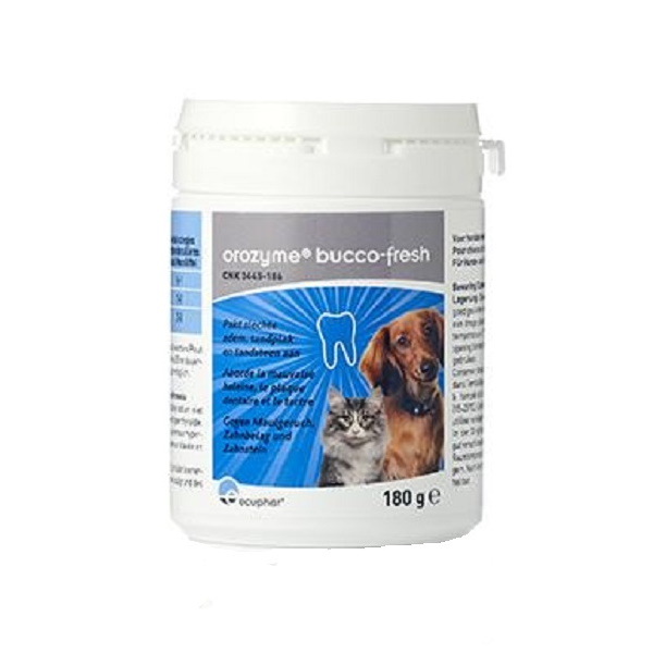 Orozyme Bucco Fresh is een 100% natuurlijk product op basis van een speciaal type algen. Bij dieren die het poetsen niet toestaan kan Orozyme Bucco-Fresh dagelijks aan het voeder toegediend worden. Het gemalen poeder op basis van een speciaal type algen werkt via het vasculair systeem (de bloedvaten) tot in de speekselklieren. Via het speeksel wordt de mondholte behandeld. De slechte adem verdwijnt na 3 à 6 weken toediening: een eerste bewijs van verbetering van de mond- en tandhygiëne. In tweede instantie verweekt en verdwijnt de bestaande tandplak en kan de zachter geworden tandsteen gemakkelijker verwijderd worden door middel van poetsen.