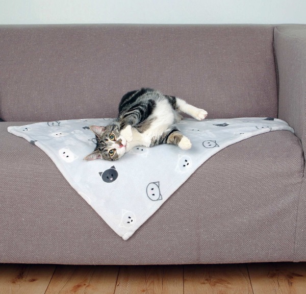 De heerlijk zachte Mimi deken van Trixie beschermt uw bekleding tegen vuil en dierenhaar. De deken is op 30 graden wasbaar en de afmeting is 70x50cm. De kleur is lichtgrijs met als patroon zwarte en witte poezenkopjes.