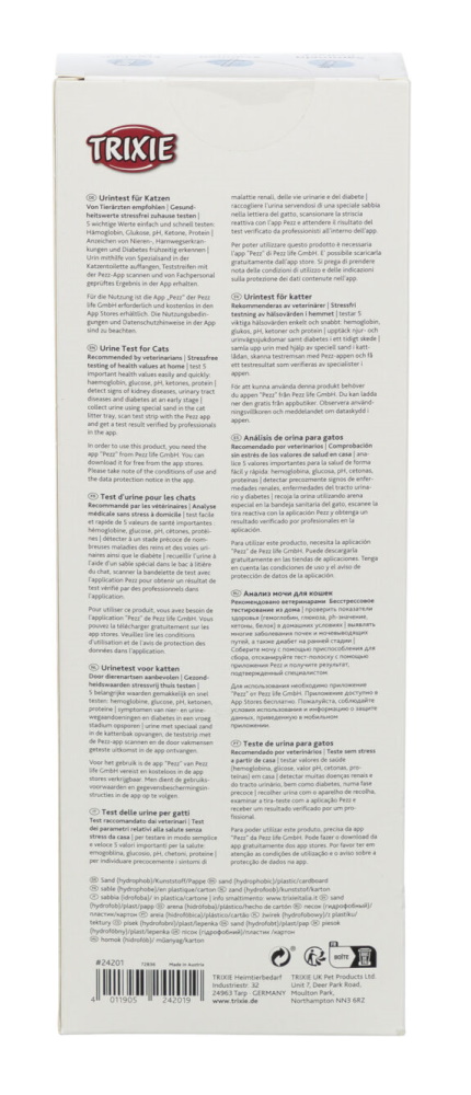 Met de Trixie Urinetest voor katten kunt u uw kat thuis testen op een aantal belangrijke gezondheidswaarden: hemoglobine, glucose, pH-waarde, ketonen en proteïne. Hiermee kunt u symptomen van nier- en urinewegaandoeningen en diabetes in een vroeg stadium opsporen.