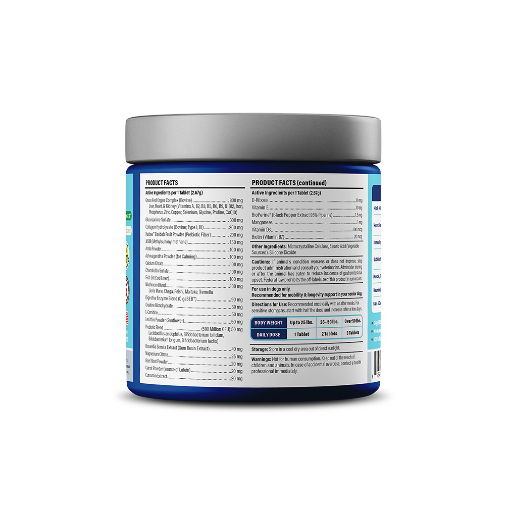 Vetericyn All-IN 1 Senior Support hondensupplementen vullen het vitale system van uw oudere hond aan met de perfecte hoeveelheid voeding. De supplementen bevatten de belangrijkste voedingsstoffen die uw hond nodig heeft in deze specifieke levensfase om de spijsvertering, cellen, botten, de mentale gezondheid en het immuunsysteem te bevorderen. De unieke formule, met maar liefst 8 patenten, zorgt ervoor dat alle ingrediënten worden opgenomen, hierdoor wordt het welzijn van uw hond geoptimaliseerd.