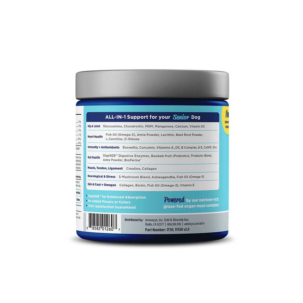 De senioren formule (7+ jaar) van Vetericyn All-IN 1 Senior Support helpt bij de algehele mobiliteit en zorgt voor verjonging van het verouderingssysteem van een seniorenhond. Bovendien zit de formule vol met prebiotica en antioxidanten die de algehele spijsvertering en de gezondheid van het immuunsysteem bevorderen.
